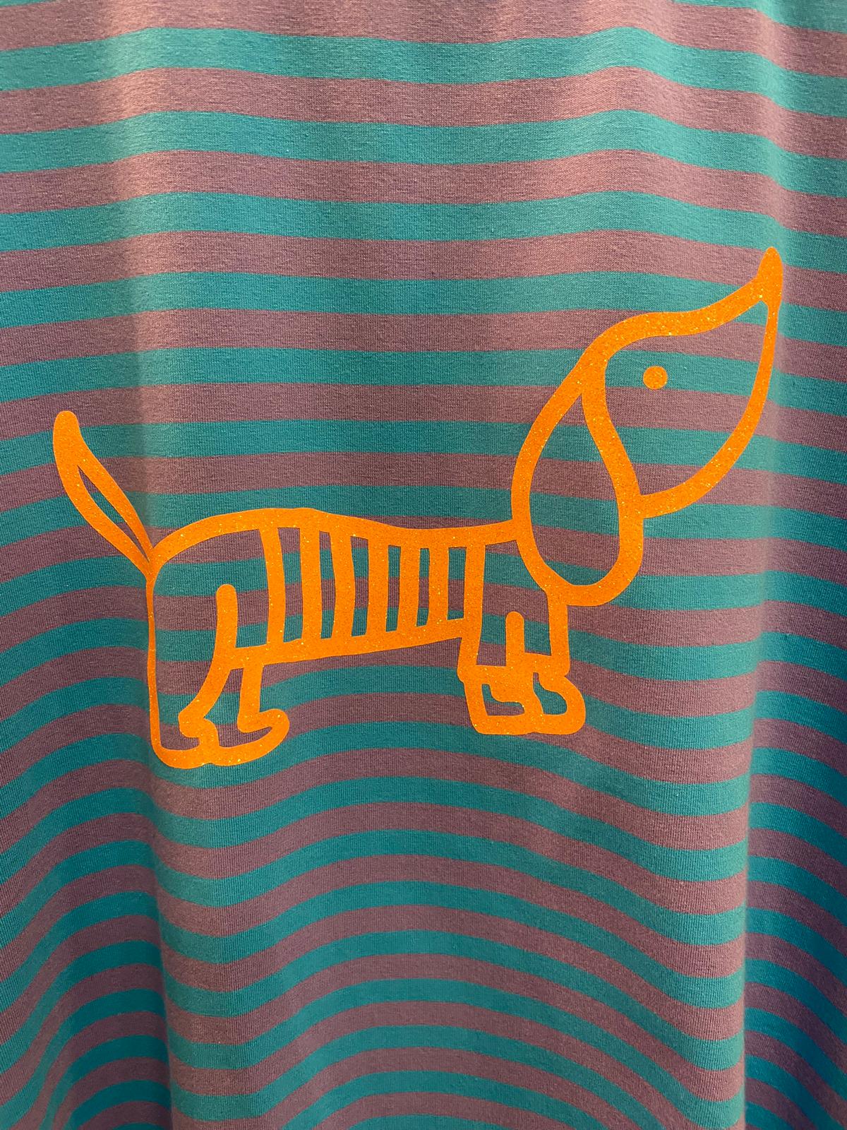 La camiseta Filippa by us es una prenda básica y cómoda, confeccionada en 100% algodón para una sensación suave en la piel. Presenta un estampado de rayas azules y moradas que añade un toque alegre, con un clásico cuello redondo y mangas cortas que garantizan frescura y libertad de movimiento. En el centro de la camiseta se puede ver la figura de un perro salchicha en color naranja.