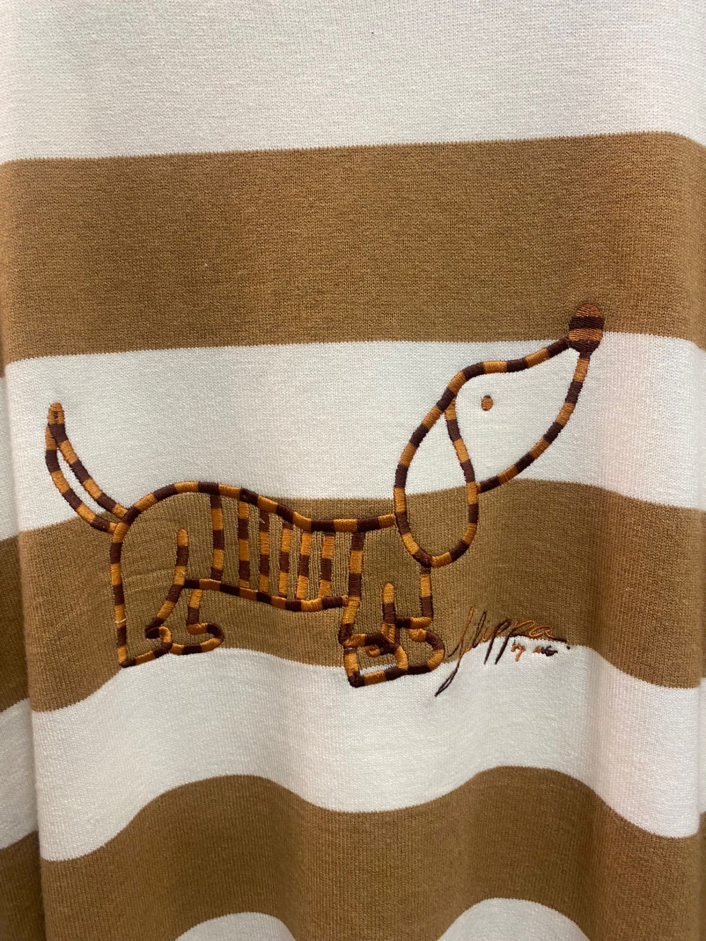 Vestido Filippa by us de rayas blancas y marrones es una prenda básica y versátil, confeccionada en 100% algodón para una suavidad y transpirabilidad óptimas. En el centro tiene la silueta de un perro salchicha en color marrón oscuro. Con un cuello redondo clásico y mangas largas, es perfecto para climas frescos.